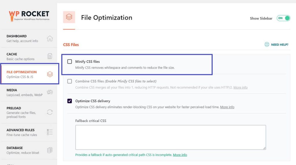 WP Rocket – File Optimization tab with minification enabled